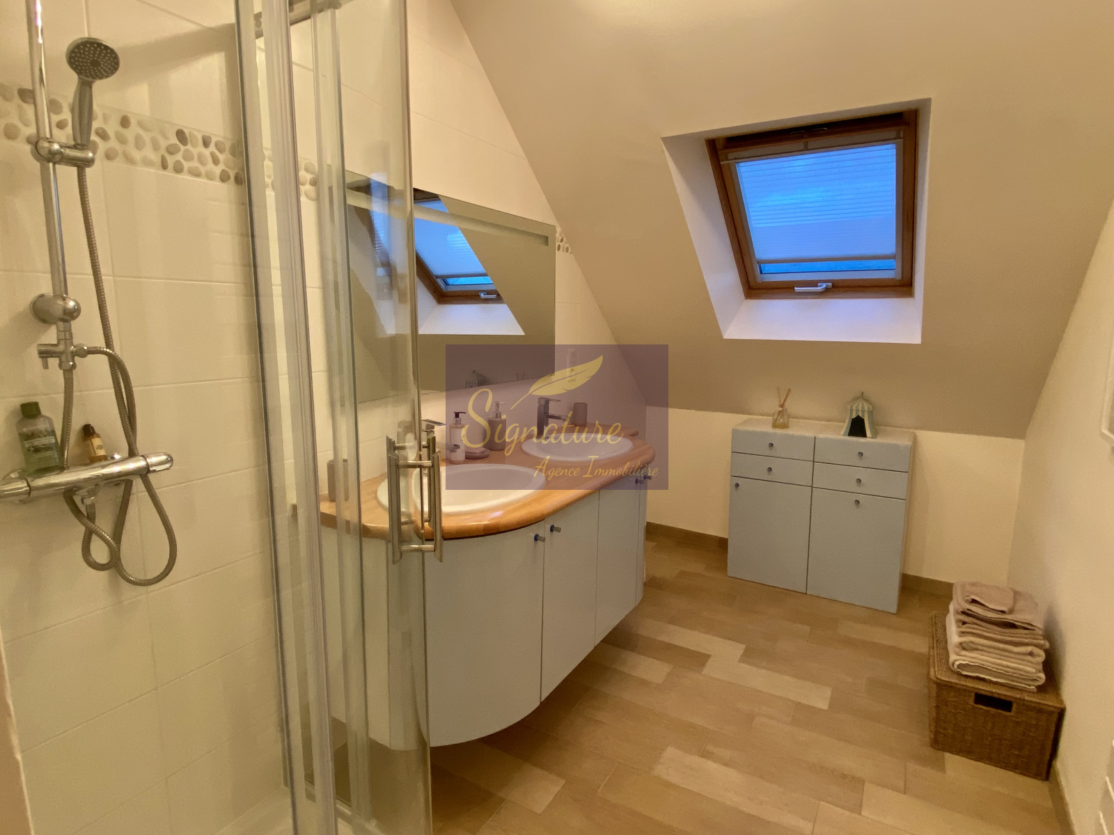 Au premier vous découvrez un grand palier qui dessert deux belles chambres dont une avec bureau ou dressing, salle de bains, toilettes séparées.