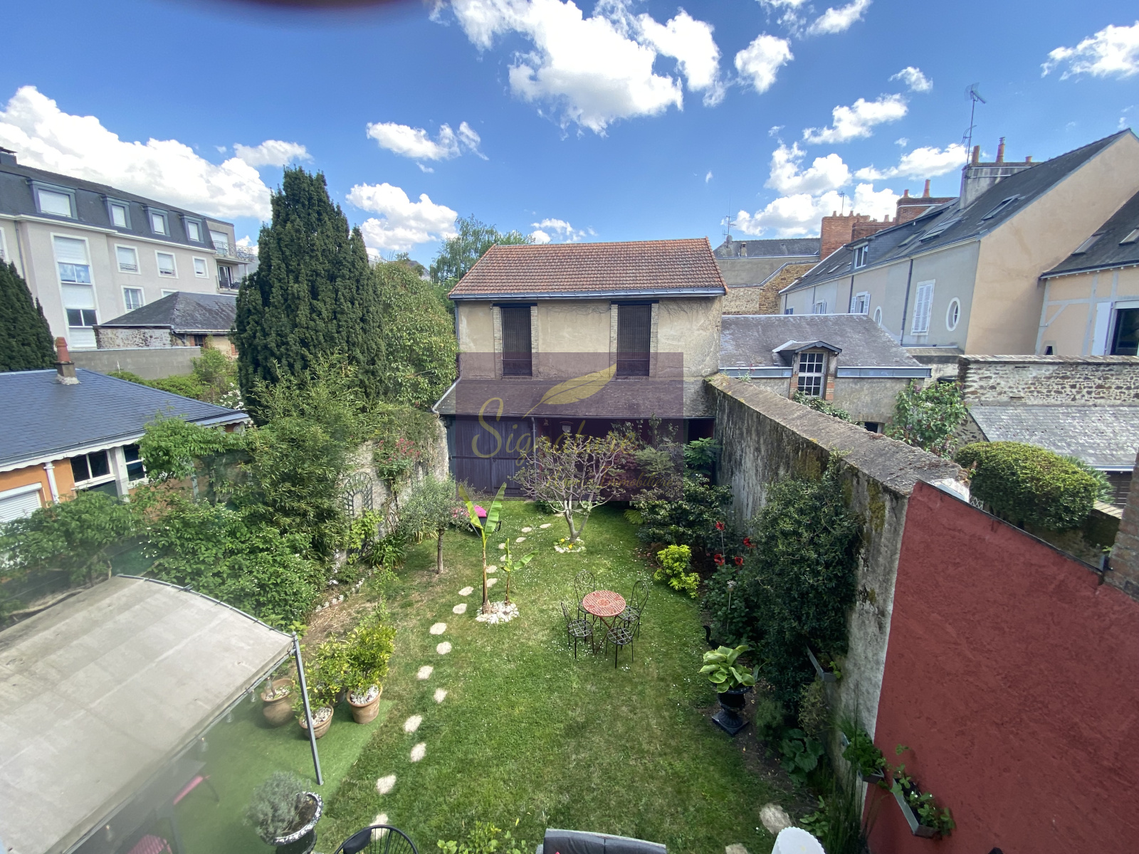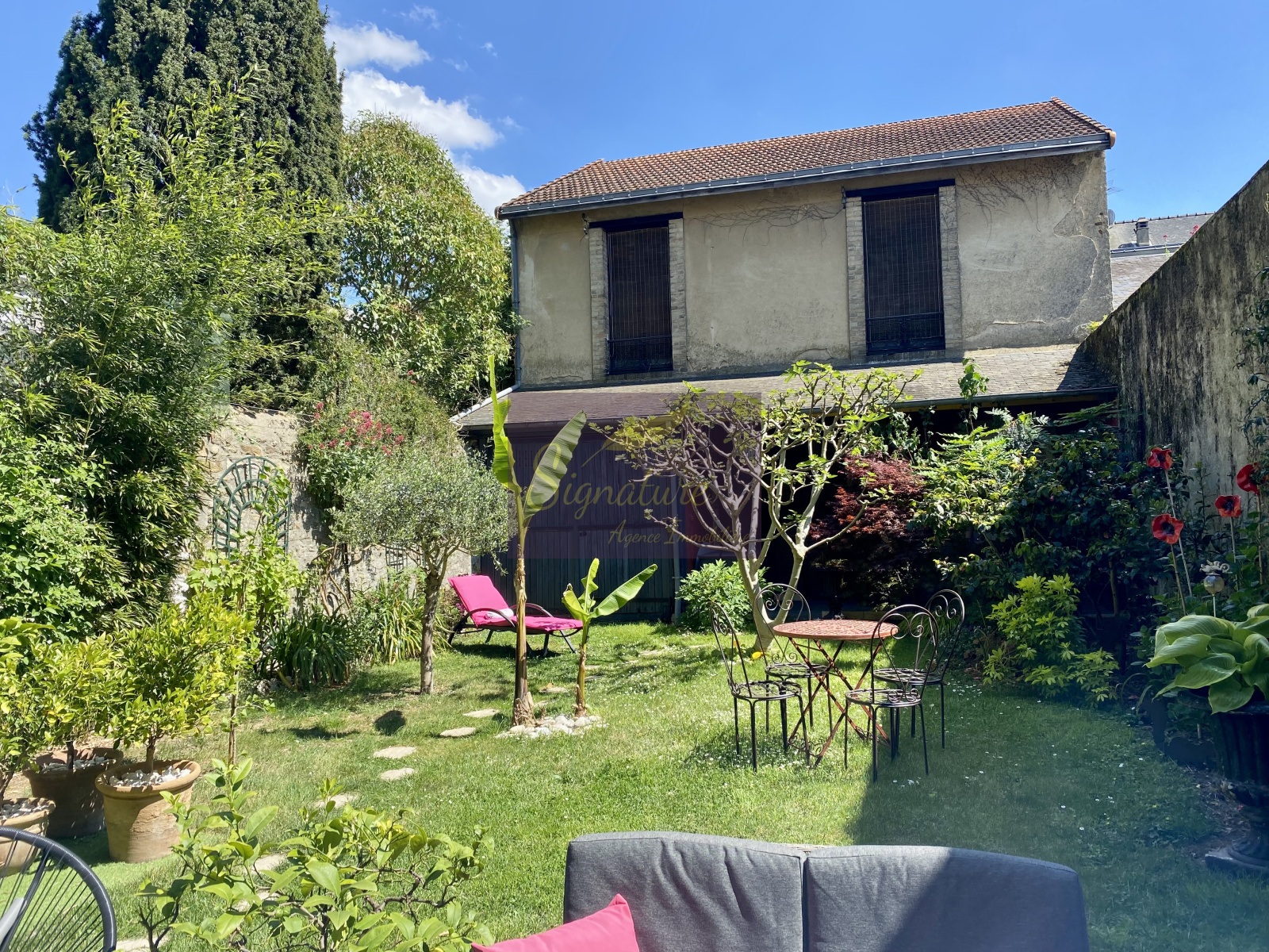 Un Jardin clos de mur sans vis à vis avec une grande dépendance en fond de jardin, pouvant facilement faire un logement indépendant.